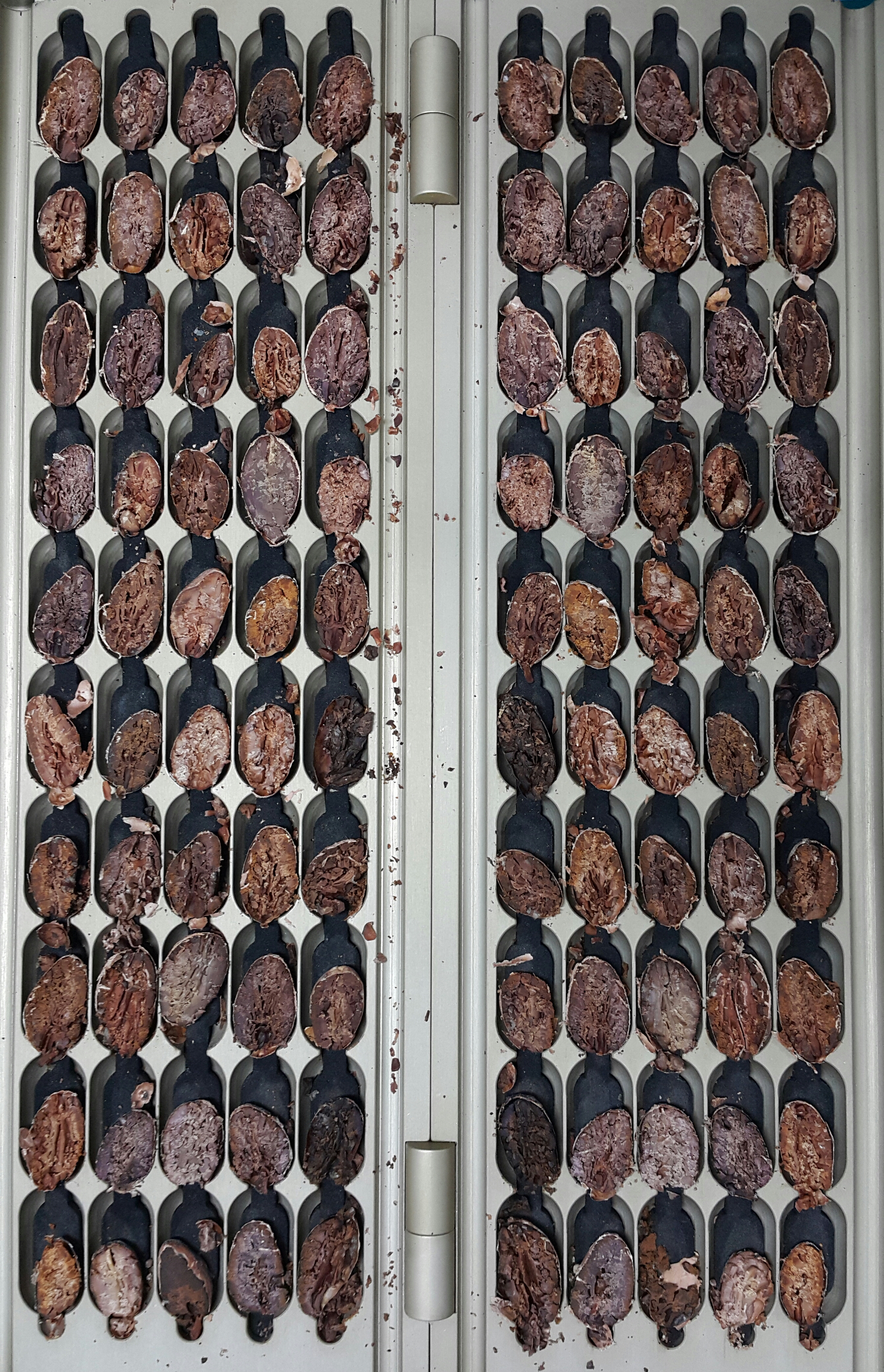Magra Cutter Unit를 사용한 카카오 빈 커팅 모습입니다. 이 Unit를 사용하여서 커팅이 안전하고 편리하며, 발효 상태를 보는데 있어서 진열상태도 훌륭합니다. 한 번에 50개의 카카오 빈을 커팅할 수 있습니다. 발효 상태를 판별하는 데에는 정확한 기준과 집중력, 반복된 숙련이 필수적입니다.